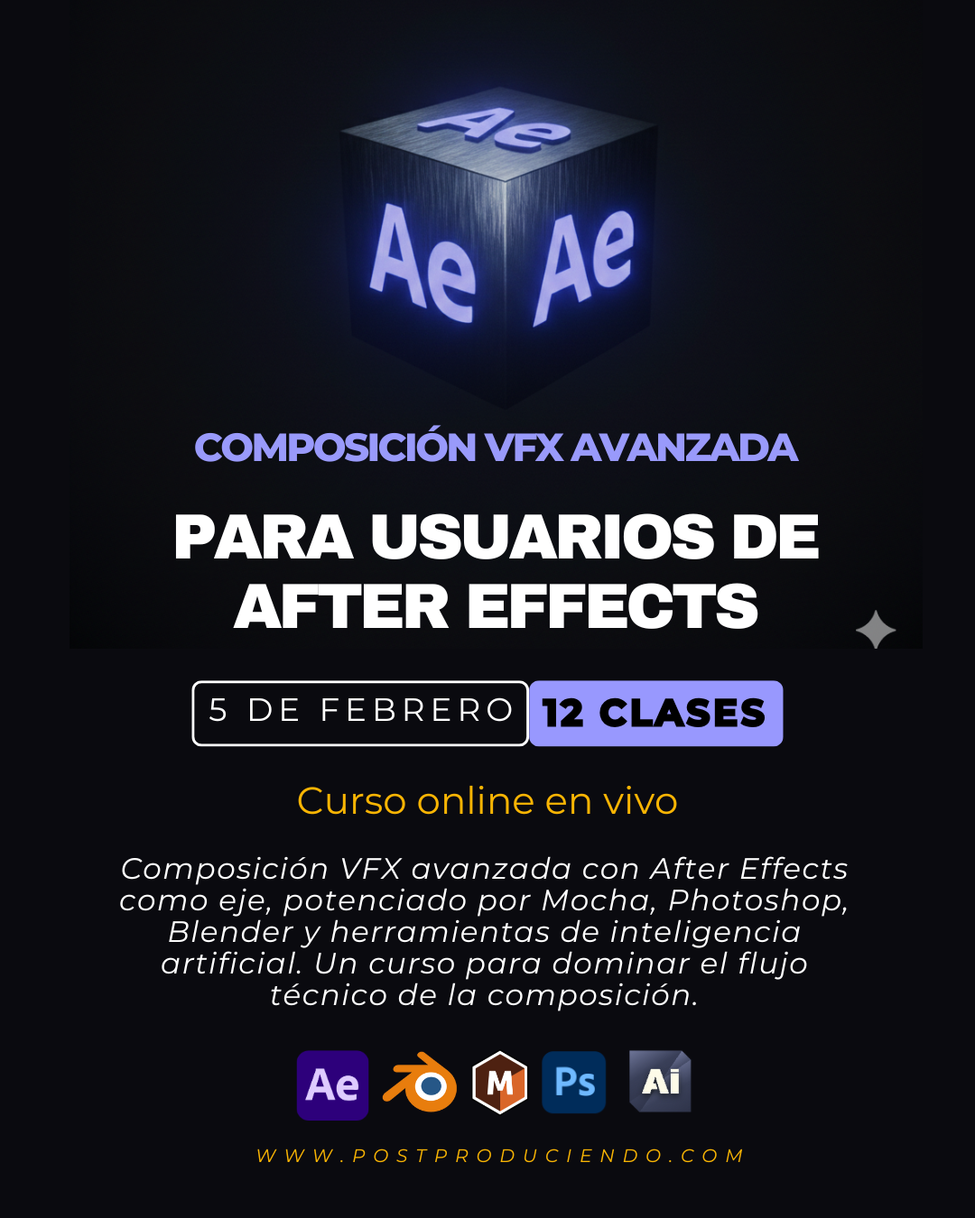 Curso avanzado de composición VFX con After Effects como eje. Aprende roto, chroma, track avanzado con Mocha, integración con IA e integración 3D usando Blender como herramienta 3D.